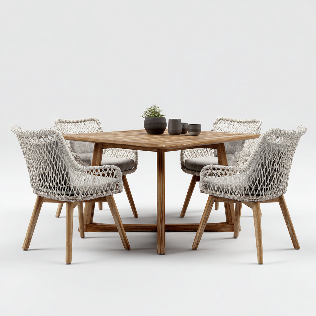 Salle à manger de jardin - bois massif et corde tressée - 130x130x75 cm - bois naturel/beige - design artisanale