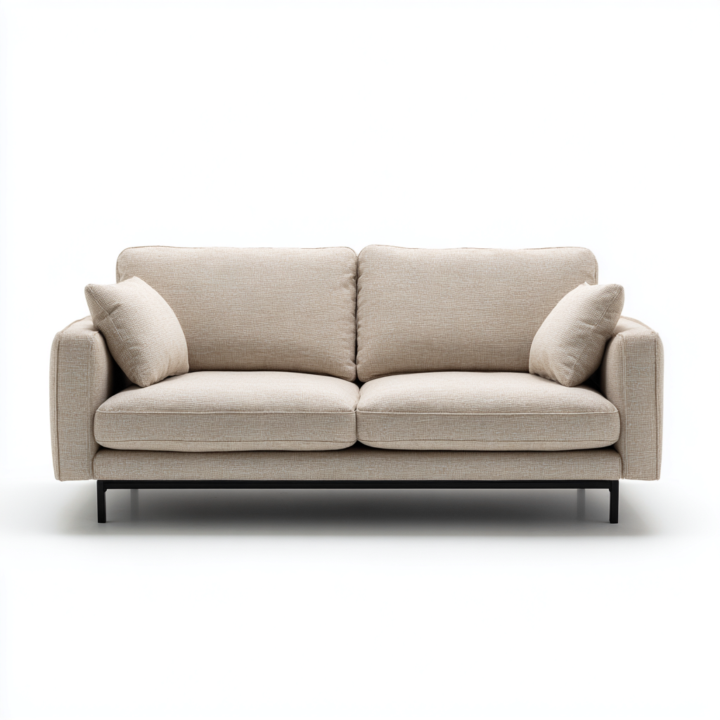 Le canapé est recouvert d'un tissu beige à la texture douce et homogène, agréable au toucher. Sa structure solide est supportée par des pieds métalliques noirs qui assurent une excellente stabilité et une bonne durabilité.