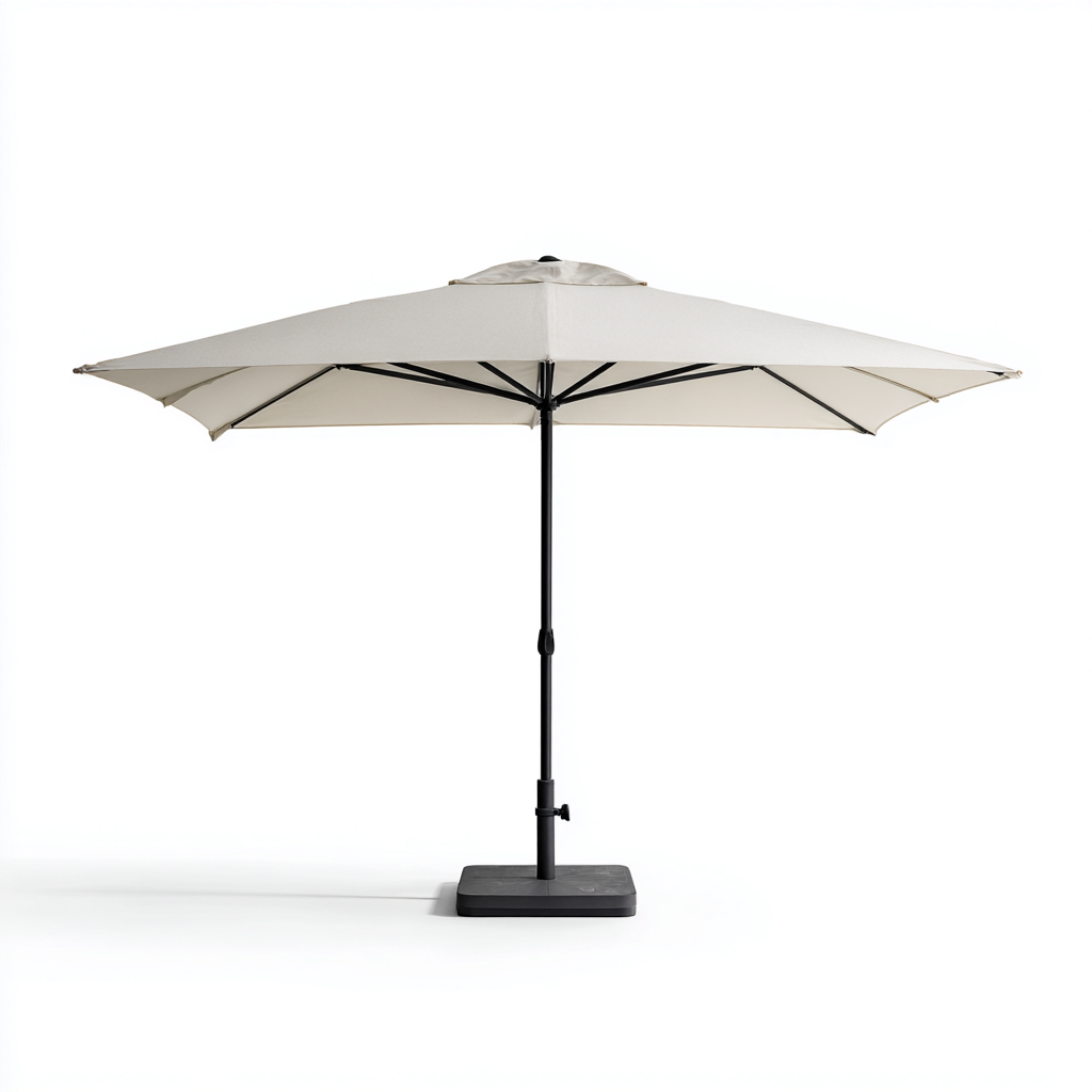 Le parasol est équipé d'un système d'ouverture simple et d'une base stable. Sa forme carrée garantit une protection solaire uniforme, en faisant un choix idéal pour les espaces de détente.