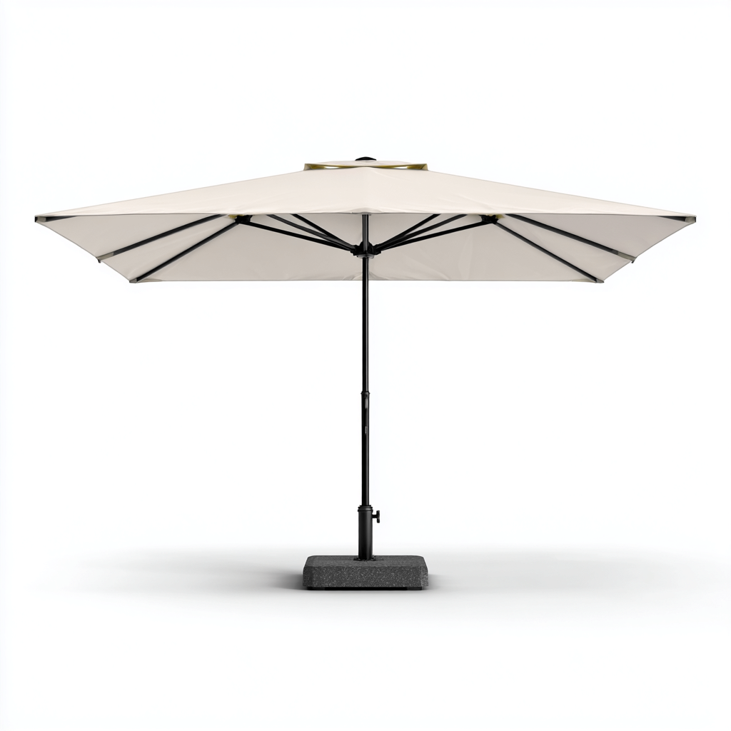 Le parasol est équipé d'un système d'ouverture simple et d'une base stable. Sa forme carrée garantit une protection solaire uniforme, en faisant un choix idéal pour les espaces de détente.