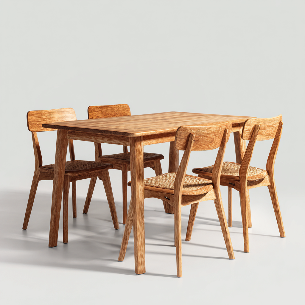 Cette salle à manger de jardin se compose d'une table rectangulaire en bois et de quatre chaises en bois avec assise en rotin. Conçu pour un usage extérieur, l'ensemble offre une ambiance chaleureuse et naturelle pour aménager un espace repas dans le jardin ou sur la terrasse.