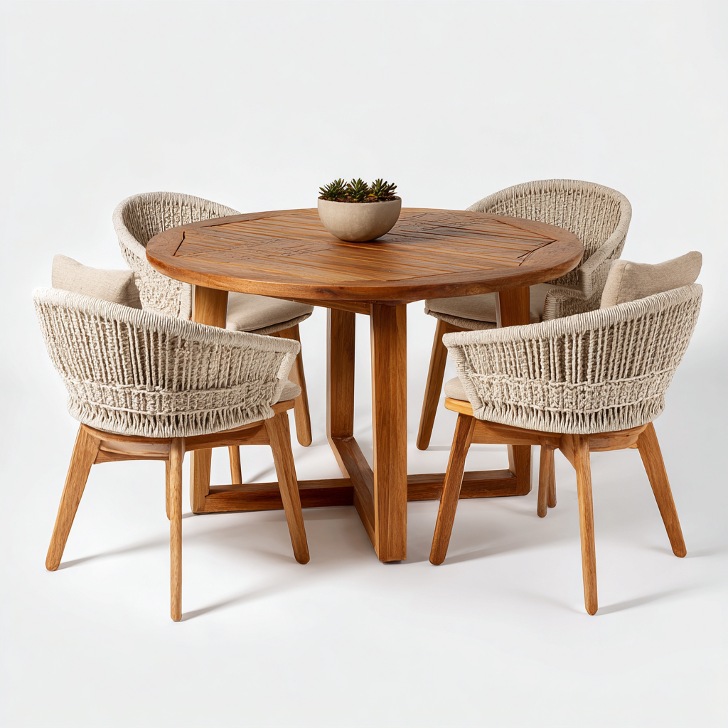 Le mélange du bois massif et du tressage en corde crée une ambiance moderne et authentique. L'ensemble est stable, confortable et conçu pour résister aux conditions extérieures lorsqu'il est correctement entretenu.