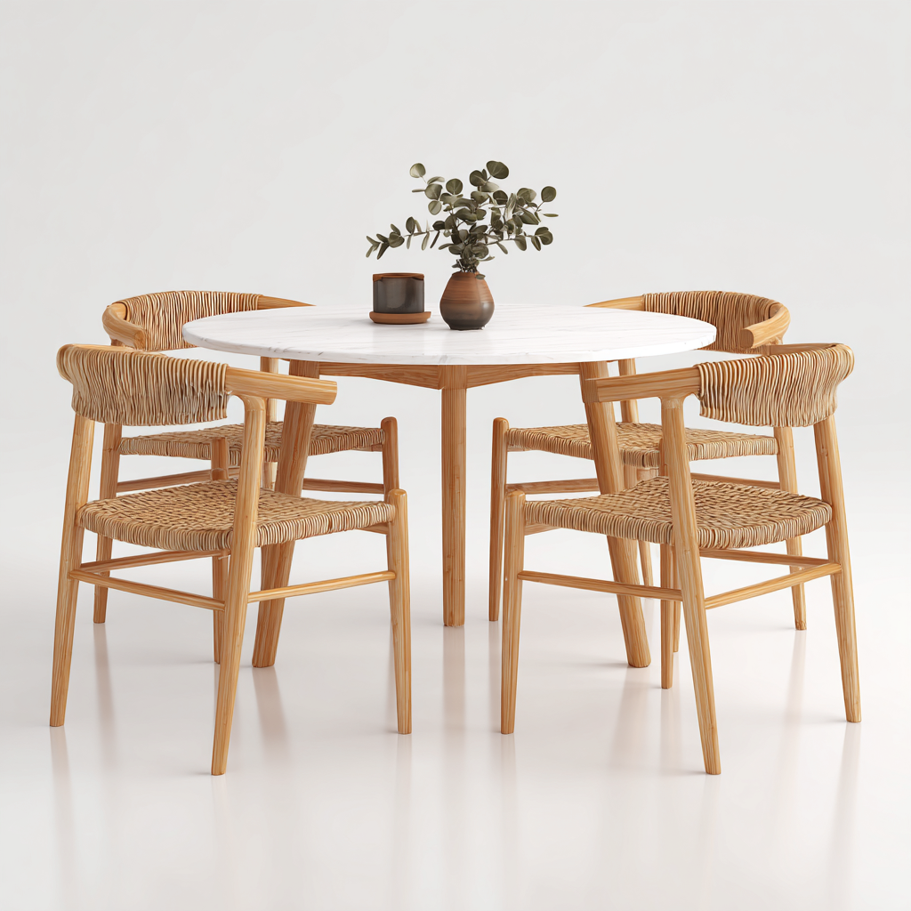 Cette salle à manger de jardin combine une table ronde au plateau blanc et quatre chaises en rotin synthétique à dossier courbé pour créer un espace extérieur naturel, chaleureux et confortable. Son design contemporain en bois naturel offre une ambiance harmonieuse et agréable pour vos repas en plein air.