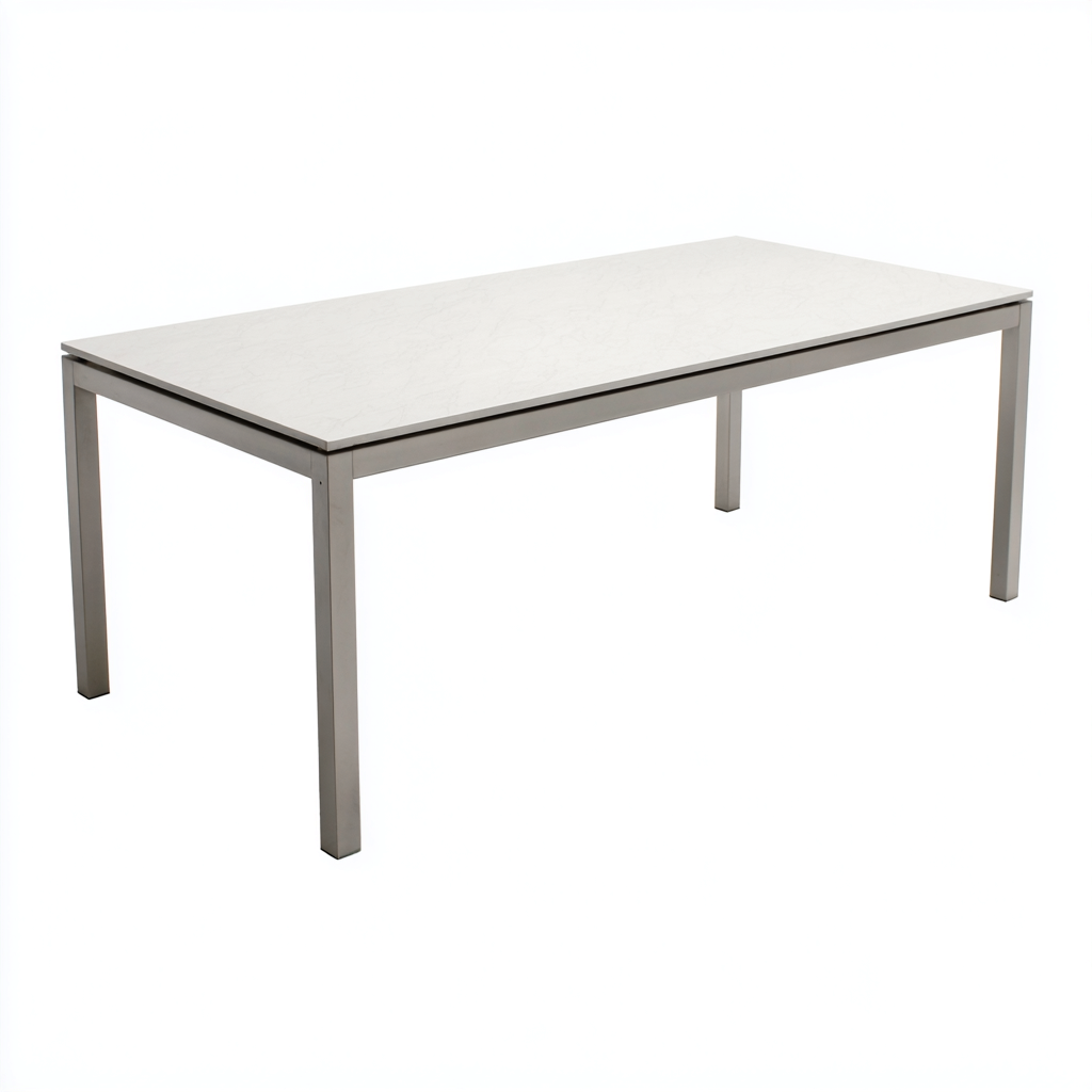 Cette table à manger rectangulaire associe un plateau en céramique blanche et une structure en métal, offrant une solution stable et adaptée à un usage quotidien.