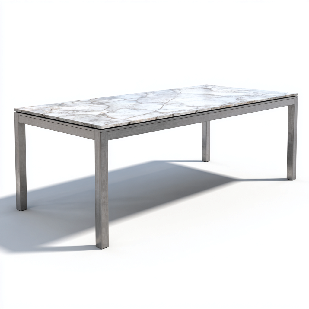 Cette table à manger rectangulaire présente un plateau en céramique blanche associé à une structure en métal, offrant une solution stable et adaptée à un usage quotidien dans la salle à manger et la cuisine.