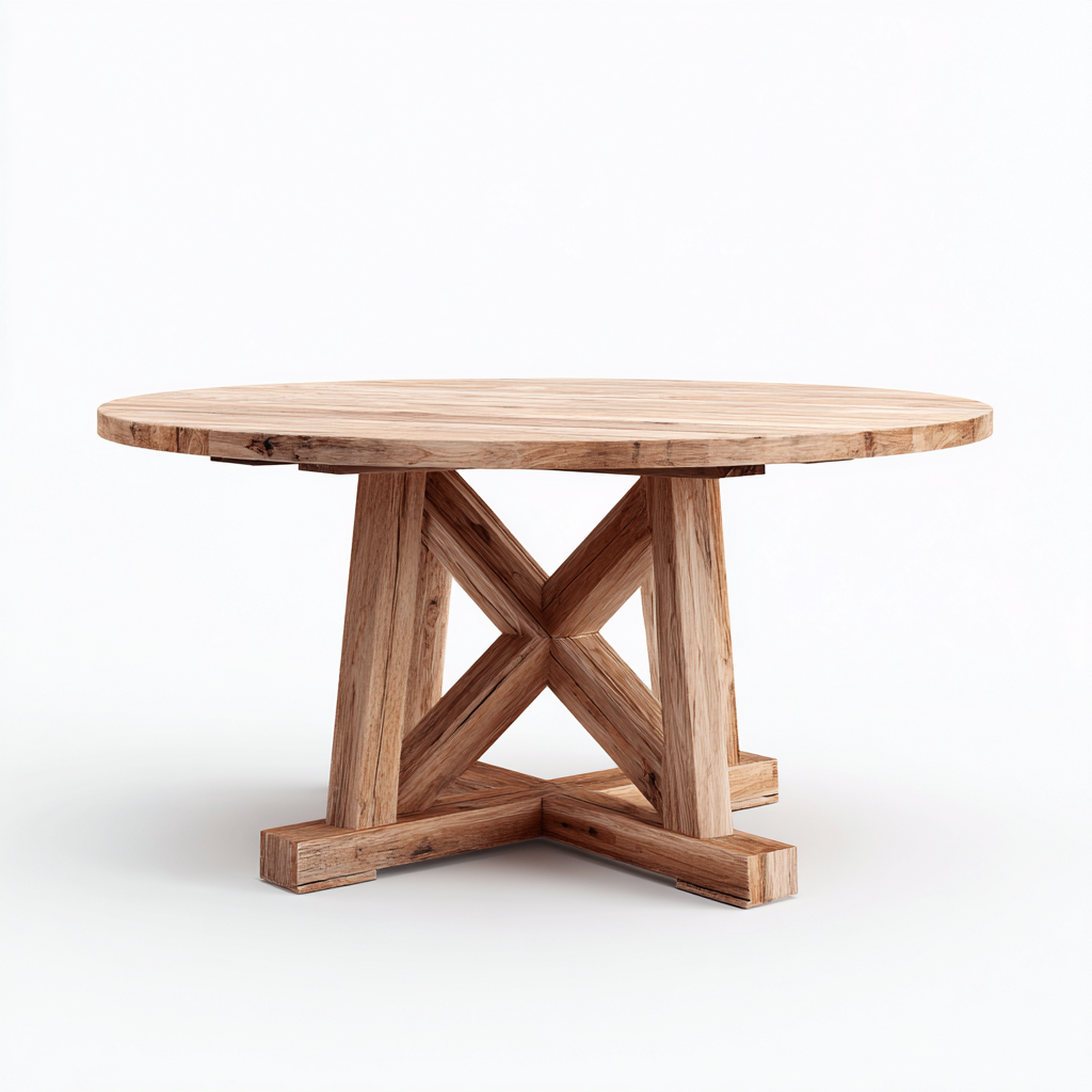 Cette table à manger ronde au style rustique met en valeur la beauté du bois naturel à travers un plateau massif et un piètement croisé sculpté. Son caractère chaleureux et authentique en fait une pièce idéale pour créer une ambiance conviviale dans une salle à manger.